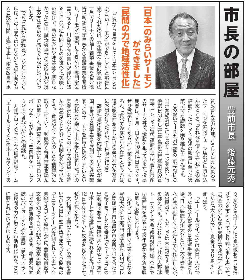 福岡県豊前市(後藤元秀市長)広報紙10月号の「市長の部屋」にて「みらいサーモン」をご紹介いただきました。