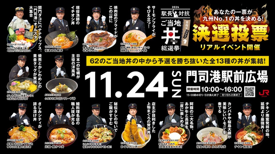決勝イベントは11月24日(日)JR門司港駅前に62品の中から予選投票を勝ち抜いた13品のご当地どんぶりが一堂に会し、実際に味わっていただけるものとなっています。
