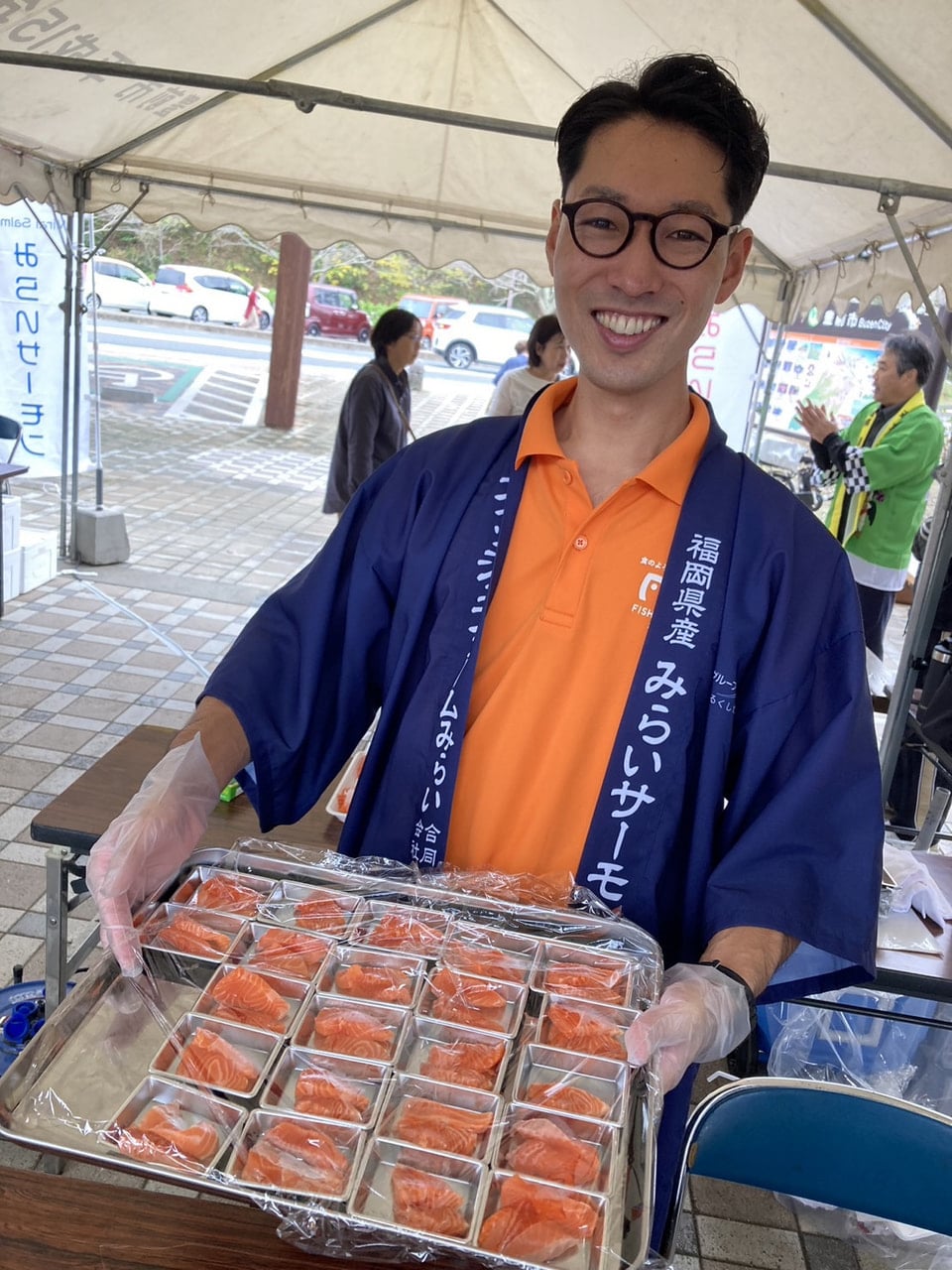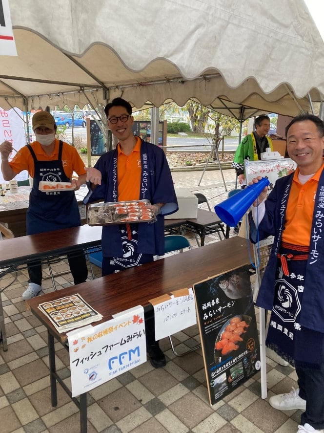 11月16日(土)、17日(日)の2日間、道の駅「豊前おこしかけ(福岡県豊前市四郎丸1041-1)」で開催された「秋の収穫祭」にて、「みらいサーモン」をご試食いただきました。