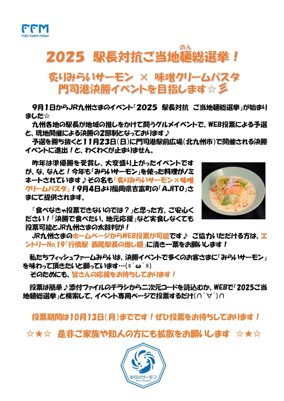 2025年9月2日 お知らせイベント情報 JR九州 駅長対抗ご当地麺総選挙 2025 ~炙りみらいサーモン ✕ 味噌クリームパスタで挑戦!~ 【JR九州さまURL】 駅長対抗2025 ご当地麺総選挙|JR九州