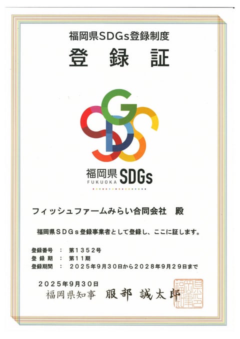 2025年9月30日、私たちフィッシュファームみらい合同会社の事業が「福岡県SDGs登録制度」に適合していると認められ、登録証を受領いたしました。