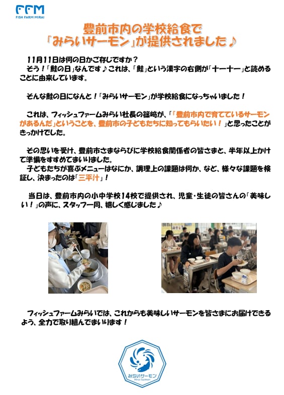 『鮭の日』に豊前市内の学校給食で「みらいサーモン」が提供されました♪